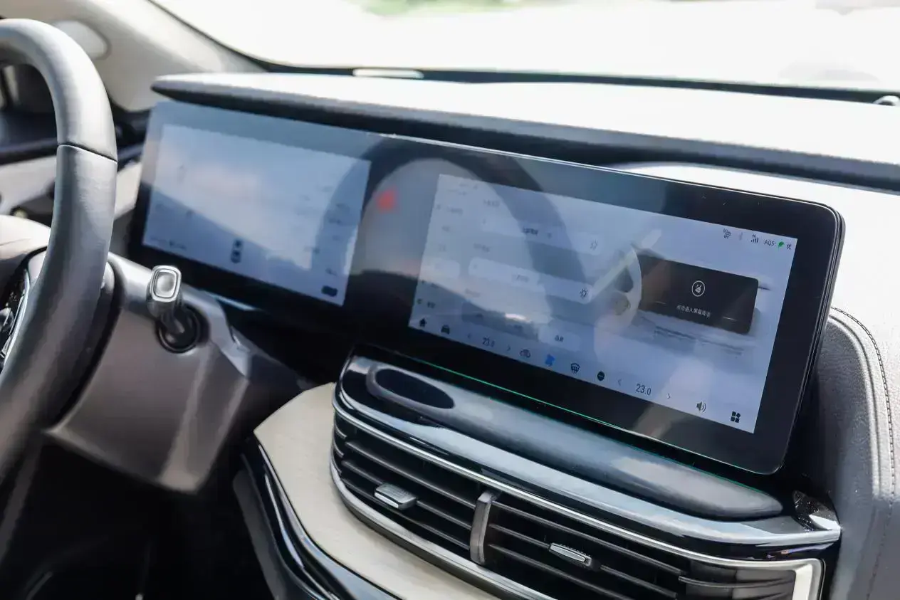 步入舒享家车内,双拼色的座舱配色营造出温馨的氛围。双12.3英寸的连体大屏基本将所有的车载功能囊括其中,换挡机构采用怀挡设计,中央扶手处除常规的储物空间与杯托外,还支持50w的手机无线快充功能。中控区域并没有过分的设计,仅保留空调出风口与木纹装饰面板。