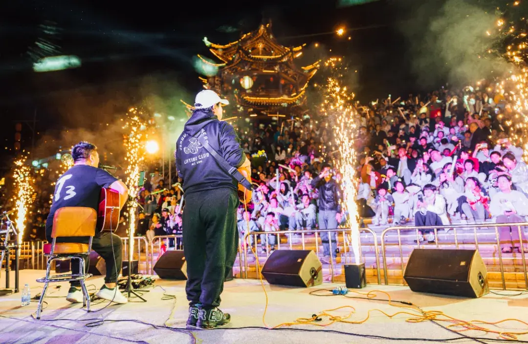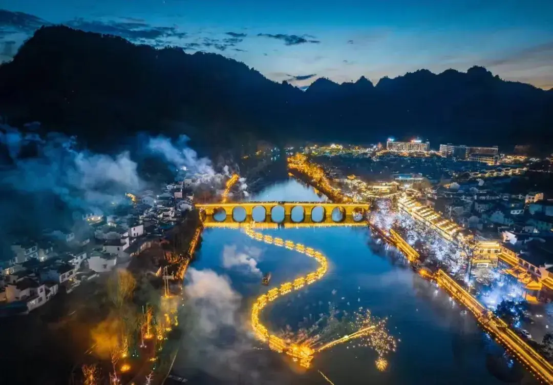 五一假期,夜晚的齐云小镇热闹非凡,齐云打铁花、鱼灯游园会、白岳落花秀、横江舞金龙等震撼演绎,浪漫花火点亮山河夜色,游客们齐聚横江之畔,看烟火与烟花在星辰下璀璨交织,感受着假期的美好与奇趣。(谷庆江、祥源齐云山度假区)