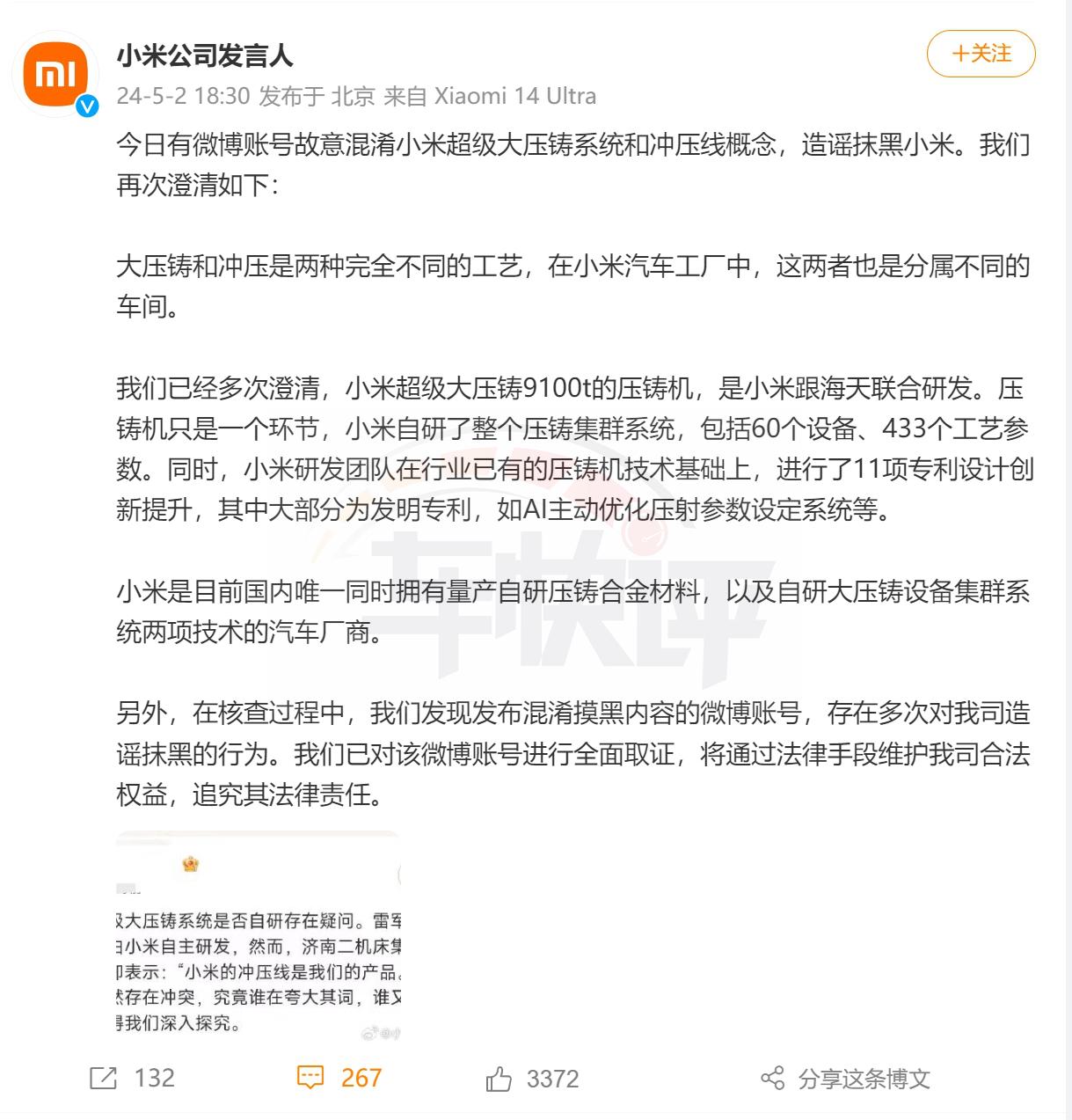 5月2日,小米公司发言人微博账号发布消息称,有微博故意混淆小米超级大压铸系统和冲压线概念,造谣抹黑小米,存在多次造谣抹黑的行为。已经全面取证,维护自身的合法权益。