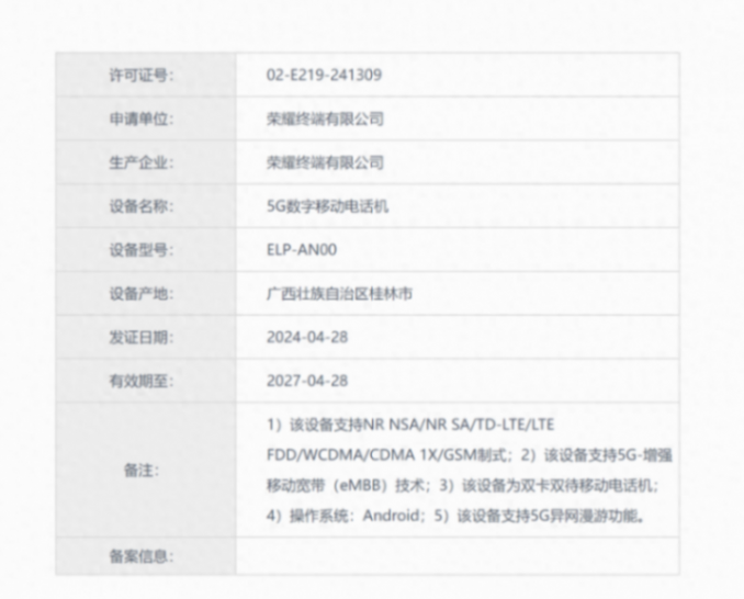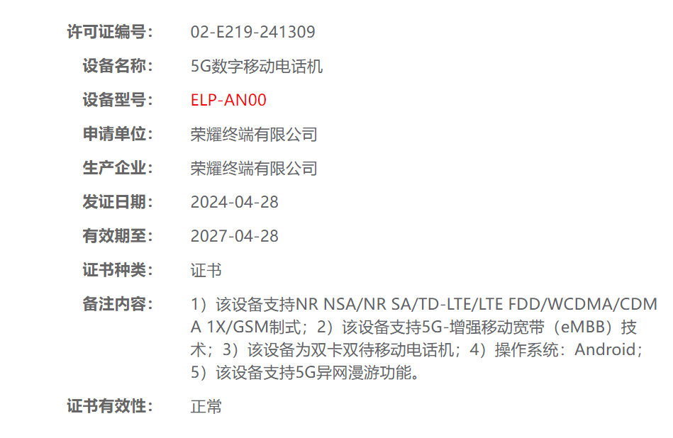 日前,有一款型号为elp-an00的荣耀新机在工信部完成入网并通过无线电核准,预计为荣耀200系列。