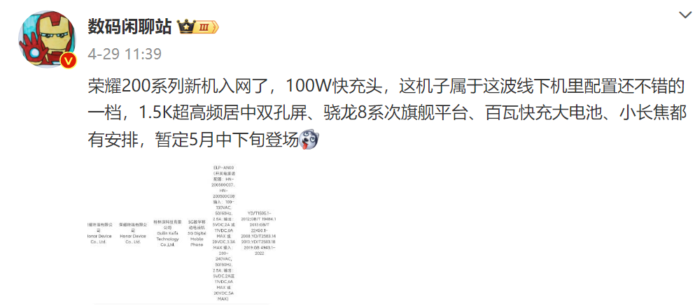 另据数码博主@数码闲聊站 此前的一份爆料中提到,荣耀200系列新机将配备1.5k超高频居中双孔屏幕,搭载骁龙8系次旗舰平台,采用百瓦快充大电池方案,搭载小长焦镜头,暂定5月中下旬登场。