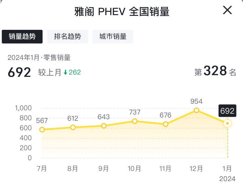 只是,2024年1月份,雅阁phev的单月零售销量,又下滑至692台。这意味着,在售雅阁phev在国内上市之后,截止到目前单月零售销量一直在1000台以下。