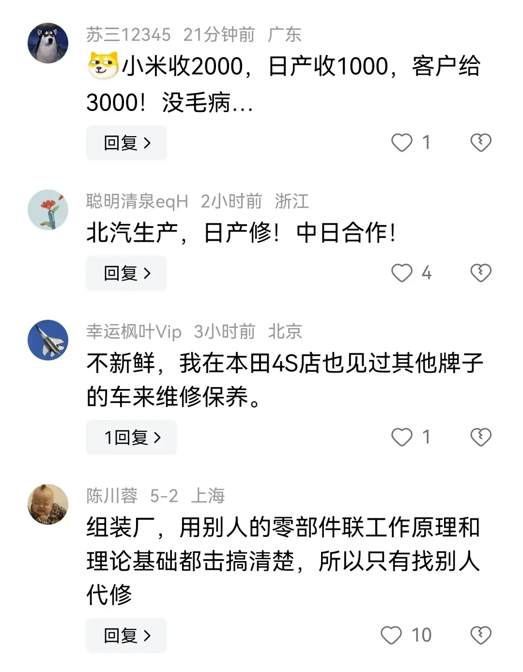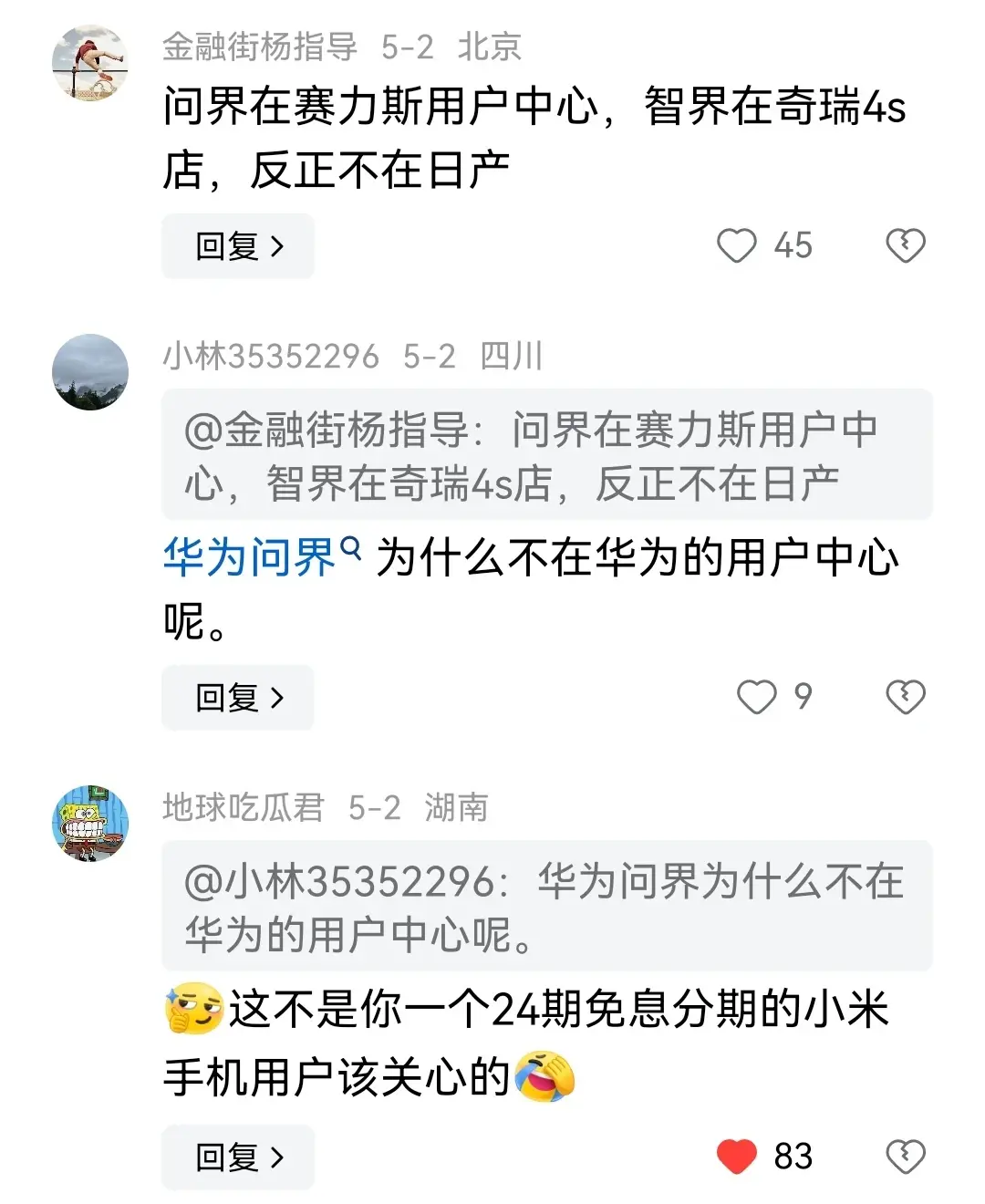 还有网友问,为什么不去国产汽车的 4s 维修店呢,难道去国产的4s店丢人吗?有些不服去的米粉反问说,问界为什么不在华为的用户中心维修,网友回答说:问界在赛力斯用户中心,智界在奇瑞4s店,反正不在日产,被网友怼的无语以对。