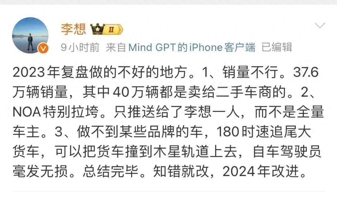 李想在微博上指出理想汽车在2023年做得不好的三个地方: