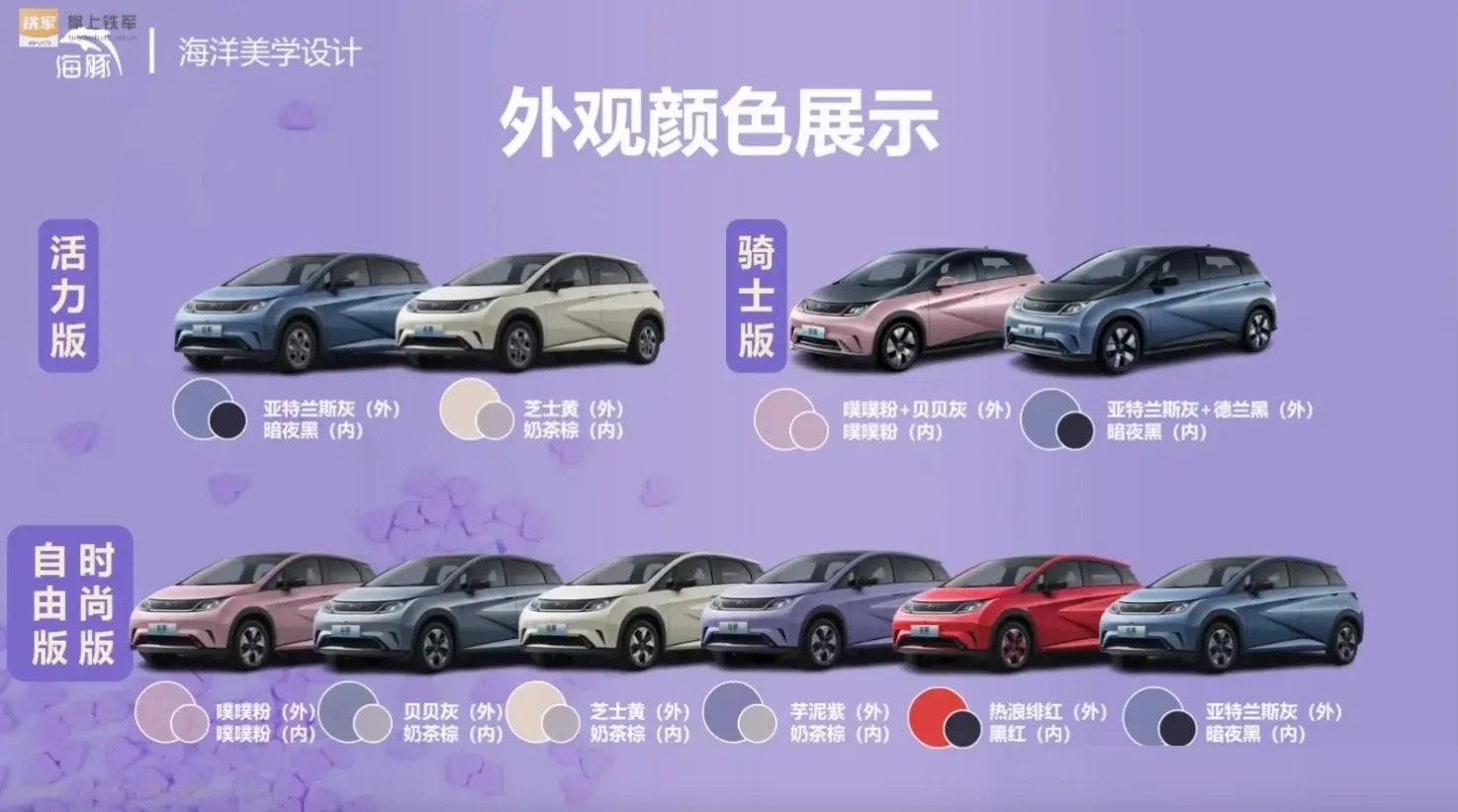 外观设计方面,海豚荣耀版基本保持了现款海豚的整体风格,取消骑士版冲浪蓝 骑士蓝配色,新增亚特兰蒂斯灰和热浪绯红两种纯色车漆选项,以及"五孔花鳍"轮圈设计,车身尺寸依旧为4125/1770/1570毫米,轴距为2700毫米。
