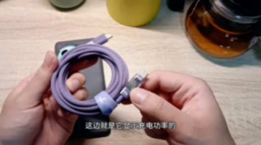 这是一根可以显示充电功率的数据线,这边就是显示充电功率的led屏。这一根充电线最高是支持pd100瓦的充电协议,这边有一个100瓦的标识,它是双typec的接口,所以这个充电器比较适合电脑的充电器使用或者typec接口的手机充电器使用。