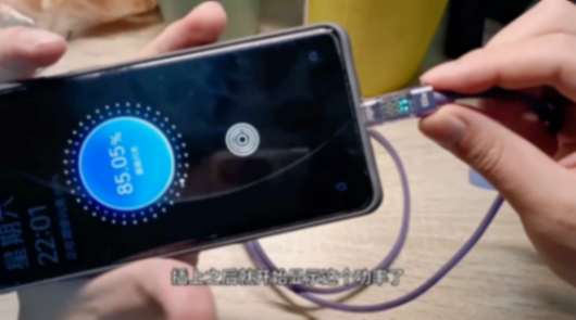 刚好这一台1加ace2pro的充电器就是typec接口的,而且这一台手机宣称的pd充电协议是45瓦,试一下用这个数据线充电到底能不能充到45瓦。现在手机的电量还剩下85%,看一下能不能激活45瓦pd快充。插上之后就开始显示功率了,直接到35瓦,36瓦,现在是46瓦,pd46瓦。