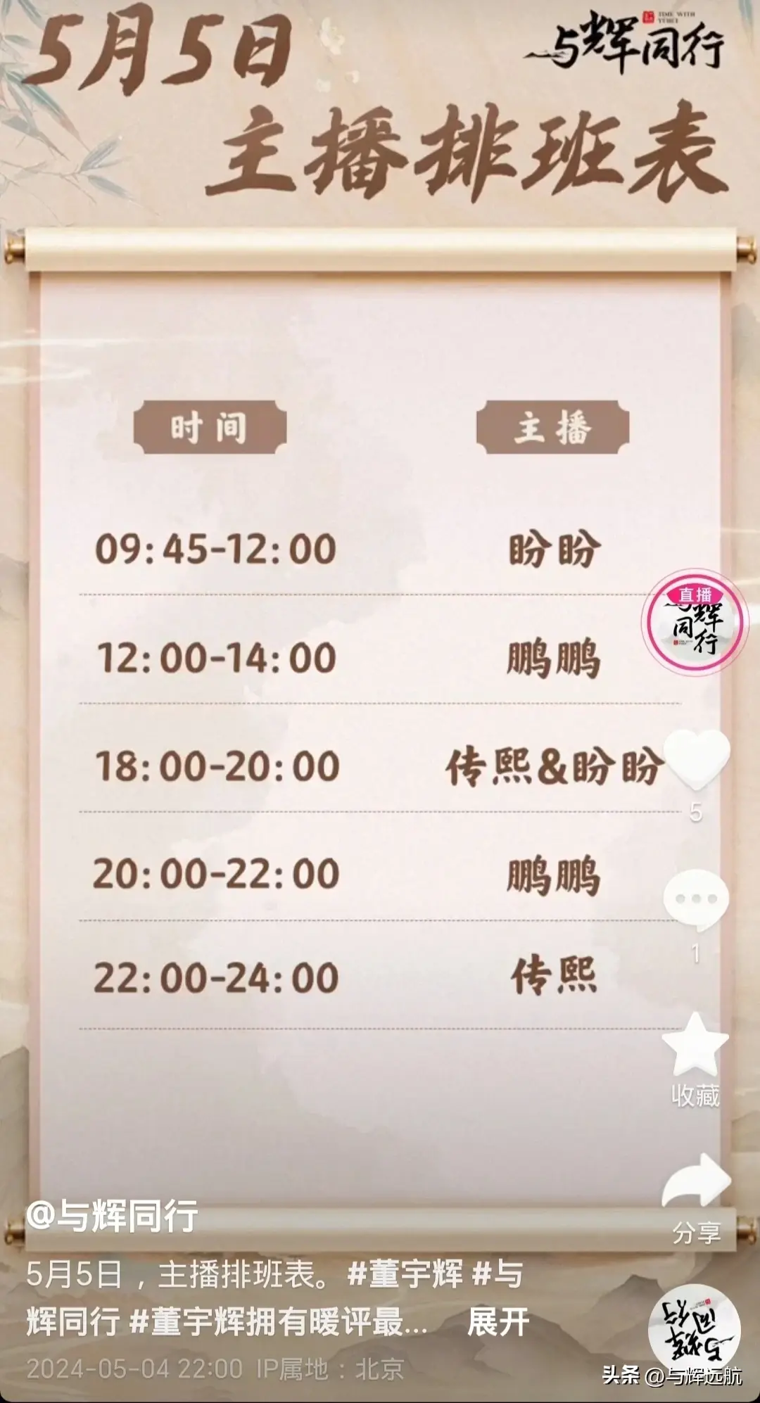 5月5日与辉同行主播排班表视频