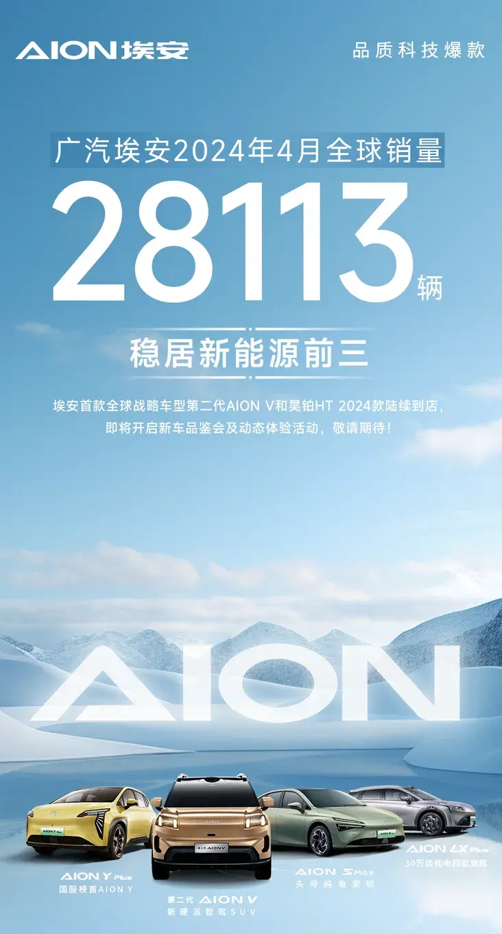 近日,我们从官方获悉,广汽埃安4月全球销量28113辆。