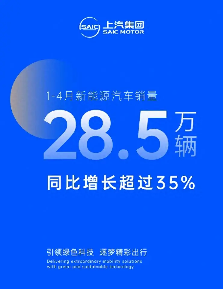 近日,从上汽集团官方获悉,上汽集团1-4月新能源汽车销量28.5万辆,同比增长超35%。