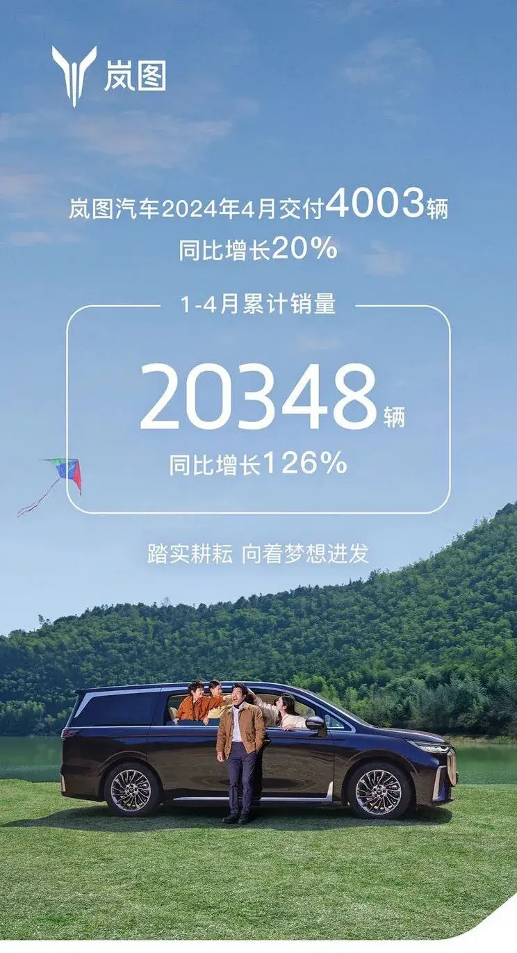 近日,我们从官方获悉,2024年4月岚图汽车交付4003辆,同比增长20%。1-4月累计销量达到20348辆,同比增长126%。