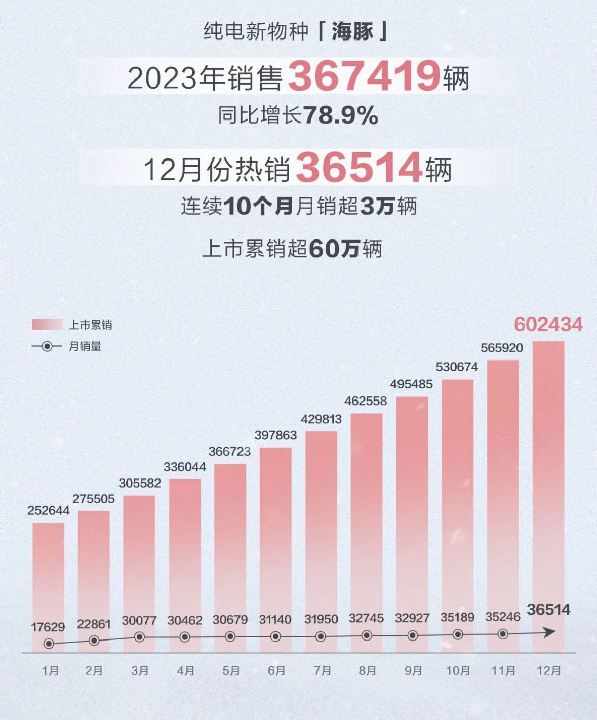 根据比亚迪官方数据,2023年,比亚迪海豚全年累计销量已经超过了36.7万台,同比增长78.9%。自整车上市以来,海豚累计销量也已经超过了60万台。毫无疑问的是,伴随着海豚荣耀版进一步降低了准入门槛,海豚荣耀版的到来,无疑将推动海豚销量再创新高。