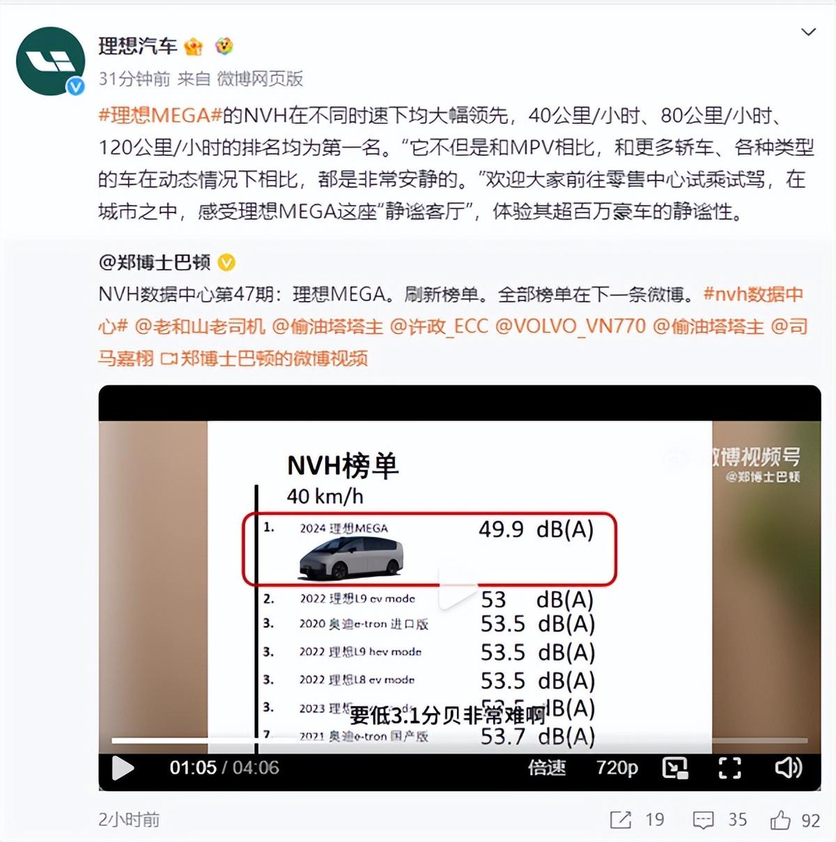 技5月6日消息,理想纯电动mpv车型mega的nvh成绩出炉了,简单总结就是“断崖式领先”。