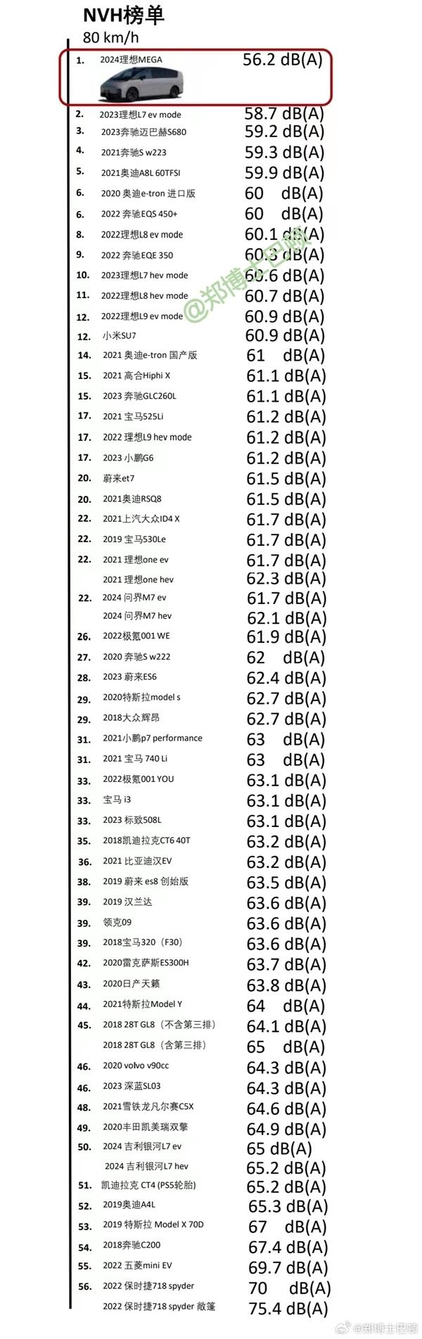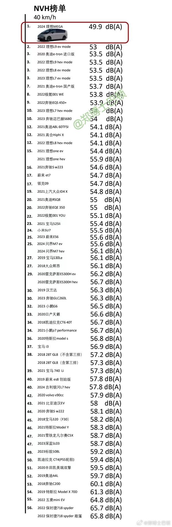 具体来看,40km/h的测试里,理想mega的车内噪音仅有49.9分贝,位列榜单第一,第二名的是用纯电行驶的理想l9,并列第三的是奥迪e-tron进口版、混动模式行驶的理想l9、纯电行驶的的理想l8和纯电行驶的理想l7。