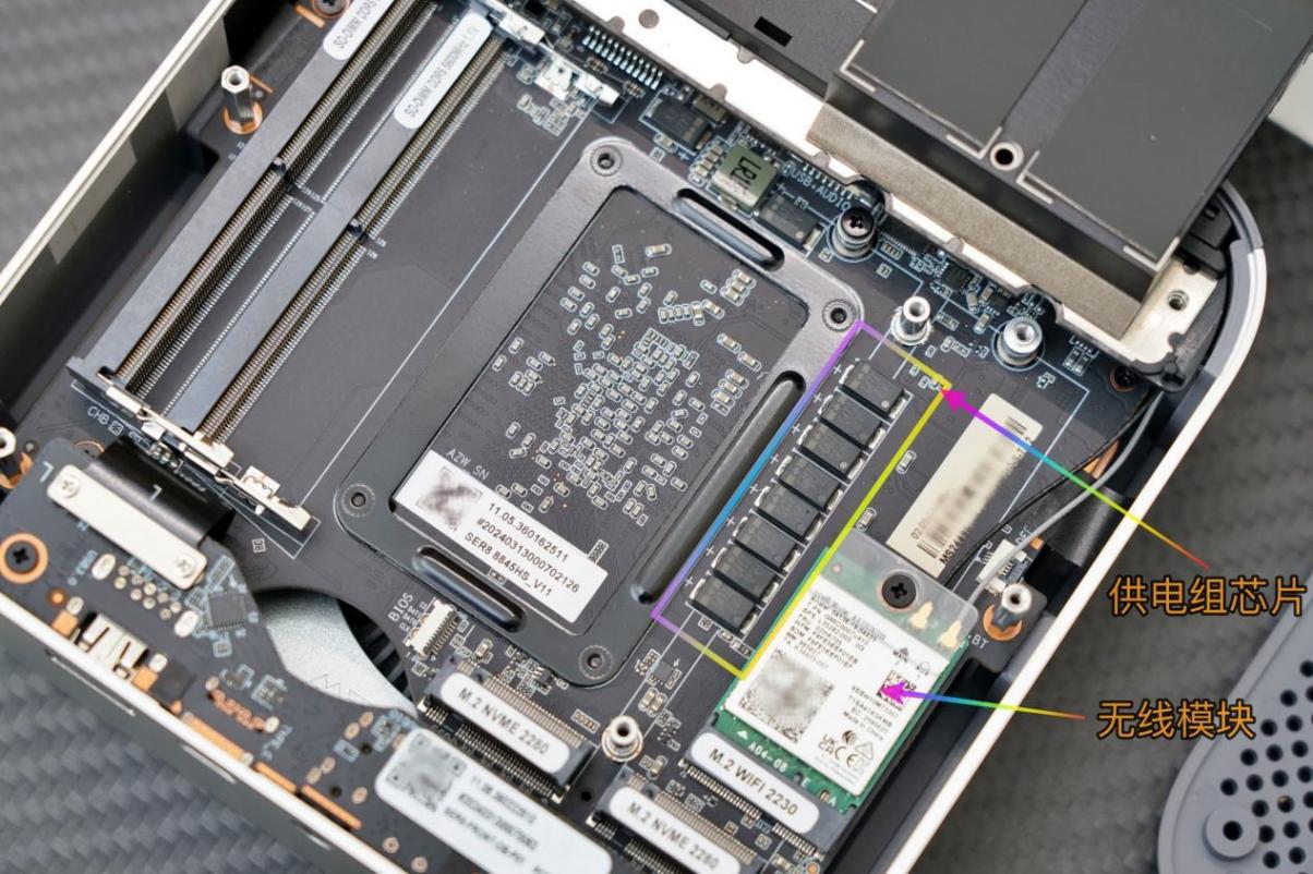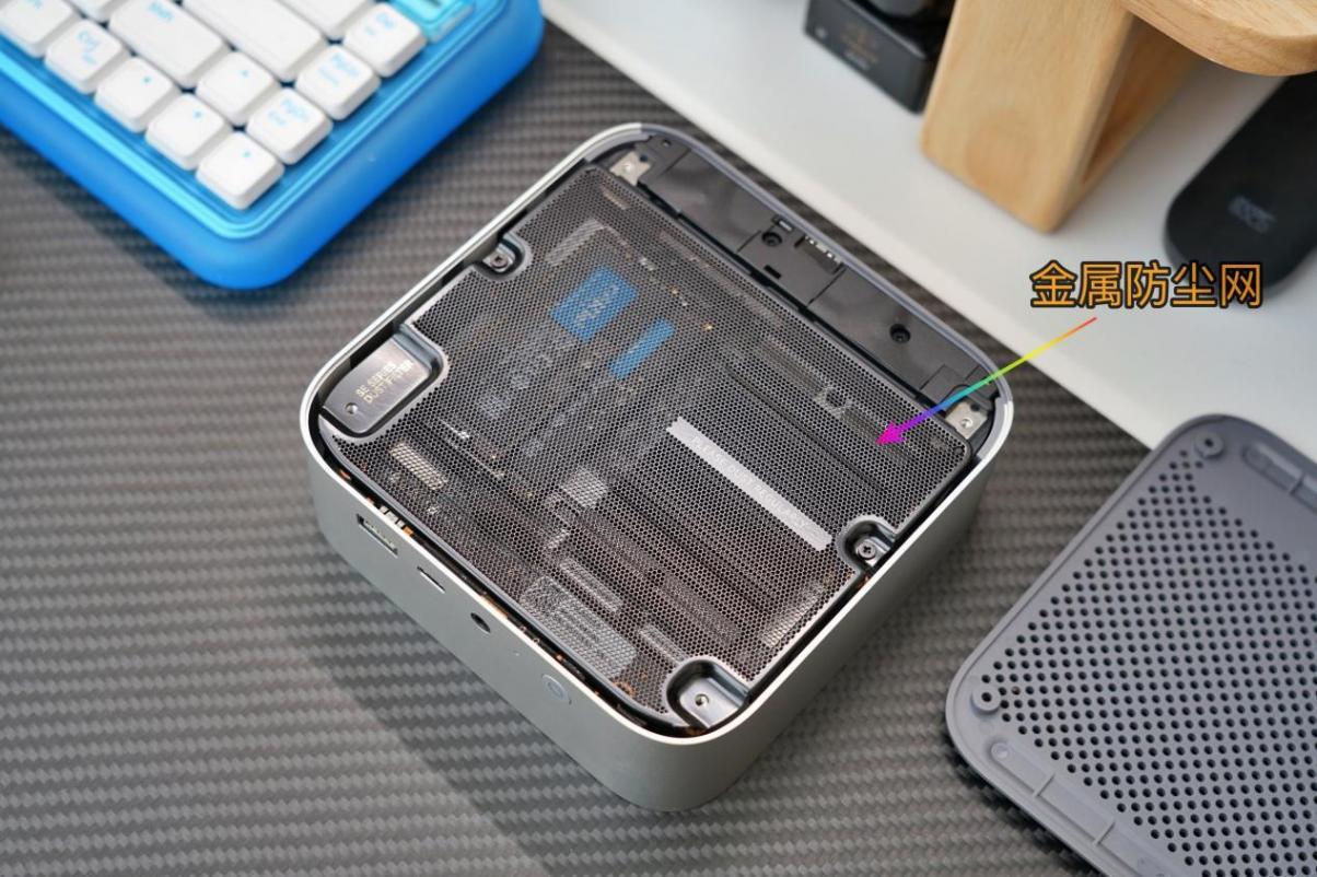 从内部来看,ser8也是大有改进,取消了不常用的2.5英寸硬盘支架,内部增加了蚀刻打孔的金属防尘罩设计,可以防止长时间运行机器内部电路板积灰。