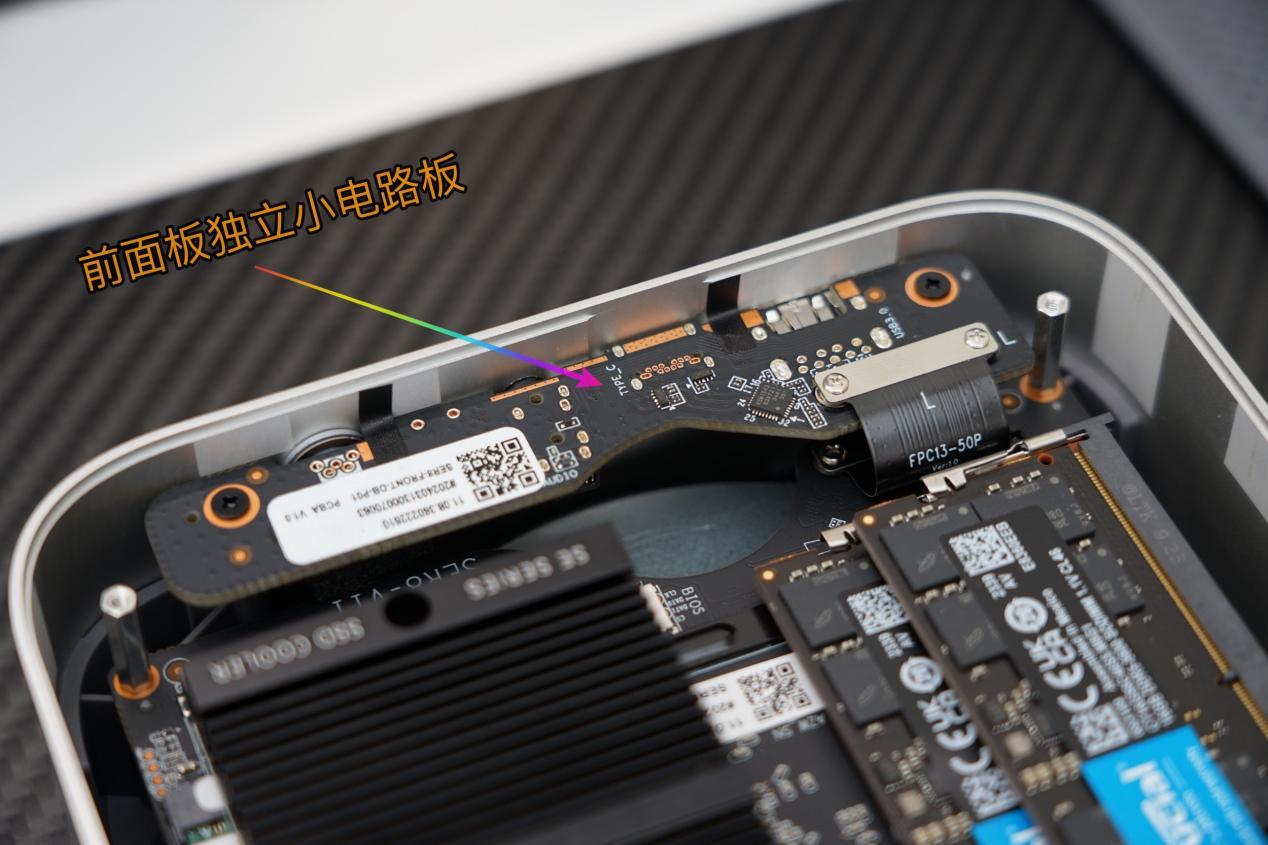 在扩展接口设计上,零刻ser8没采用此前的主板直接集成的方案,而是采用了更有利于散热的小电路板的设计。排线的固定也借鉴了苹果电脑的做法,采用螺丝 卡片的固定方式,保证了排线连接的机械稳定性。