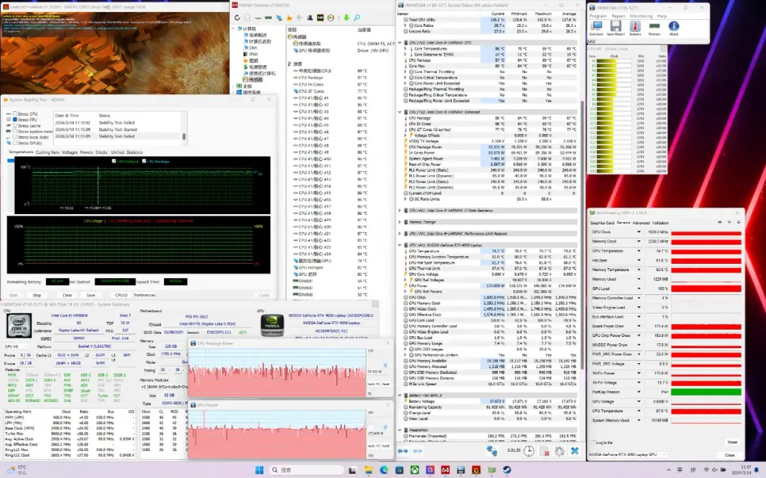 在满载状态下,开启狂暴模式,cpu温度最高89℃,稳定在88℃左右,功耗有些波动,30分钟时约为92w,p核频率3.3ghz,e核频率2.8ghz;