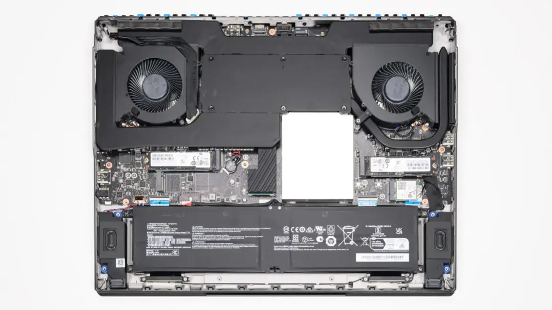 上图是微星 泰坦18 ultra泰坦的拆机实拍图,双风扇,大面积均热板加热管的组合。