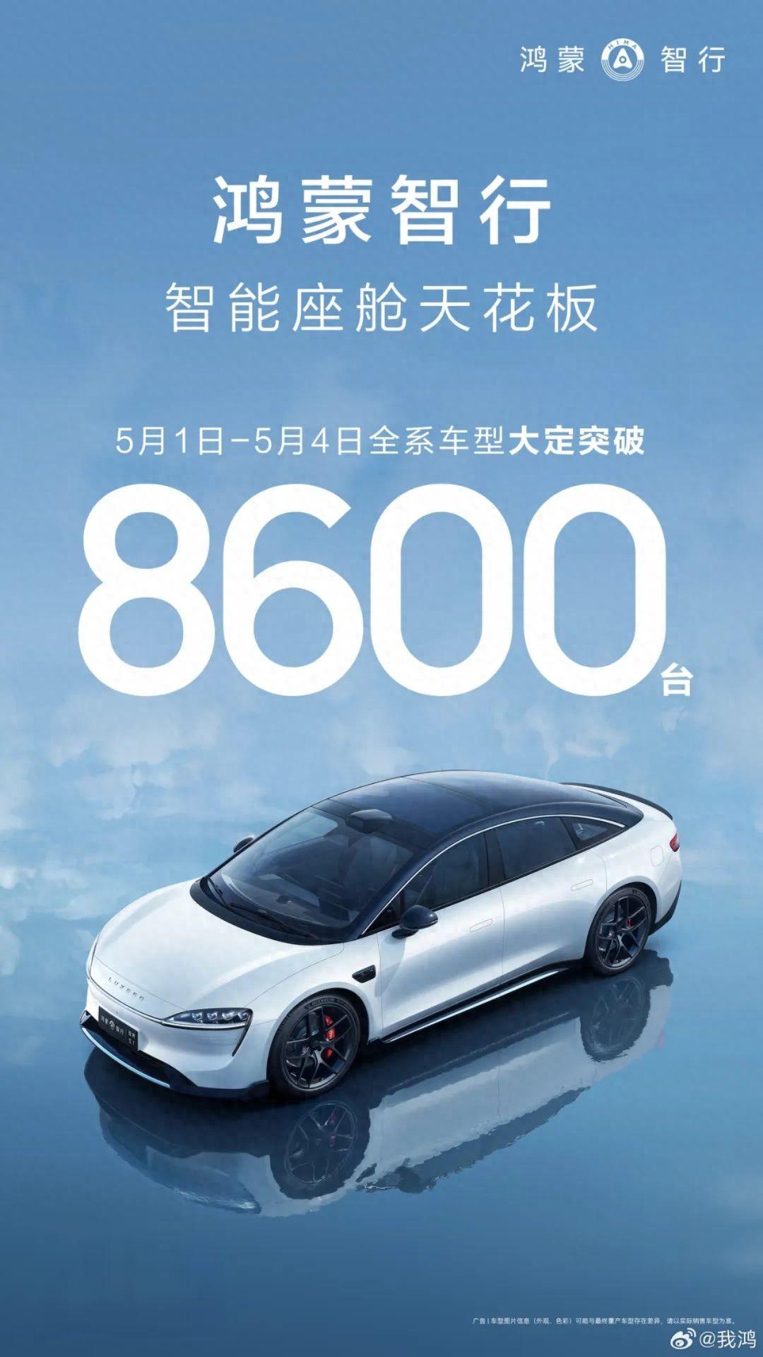 战报显示,华为智选车鸿蒙智行5月1日-4日全系车型大定突破8600台,预计今日结束也会公布假期5天的数据。