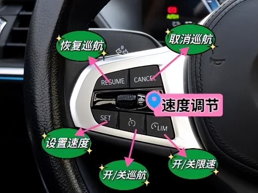 先来说方向盘左侧的按键,上方“resume”表示恢复定速巡航,“cancel”表示取消定速巡航,中间圆形长条拨片,表示定速巡航速度的调节,向上拨动一下速度 1,向下拨动一下速度-1,向上长时间拨动速度 10,向下长时间拨动速度-10。