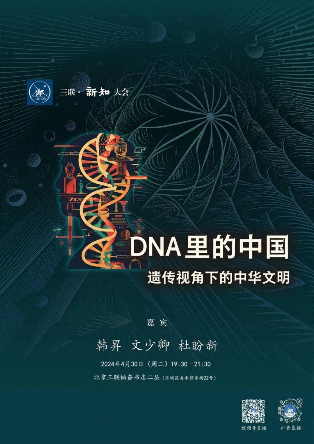 4月30日,第六季“三联·新知大会”第三场论坛“dna里的中国:遗传视角下的中华文明”,在北京三联韬奋书店美术馆总店举行。三位对谈嘉宾均来自复旦大学,分别是历史系教授、博士生导师韩昇、科技考古研究院副教授文少卿、表型组研究院博士后杜盼新。
