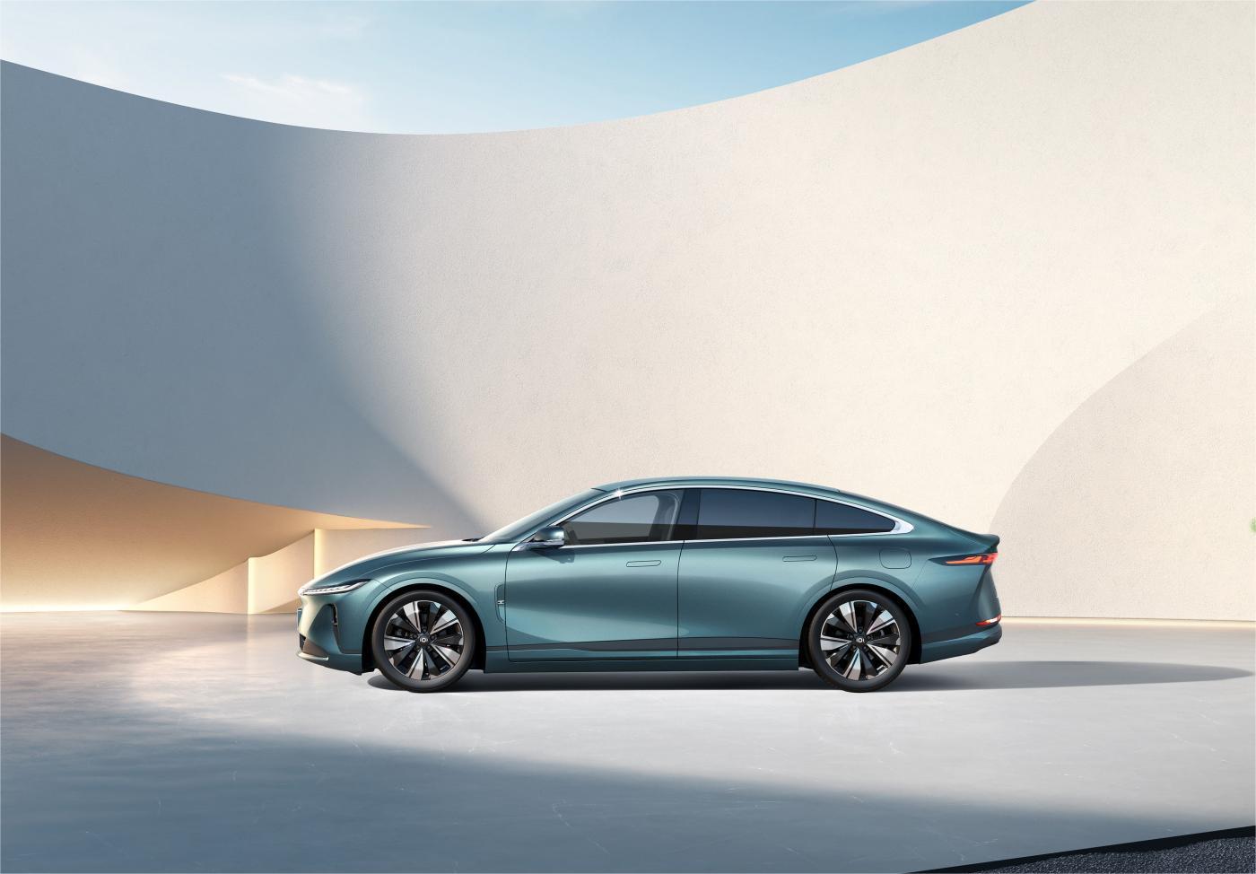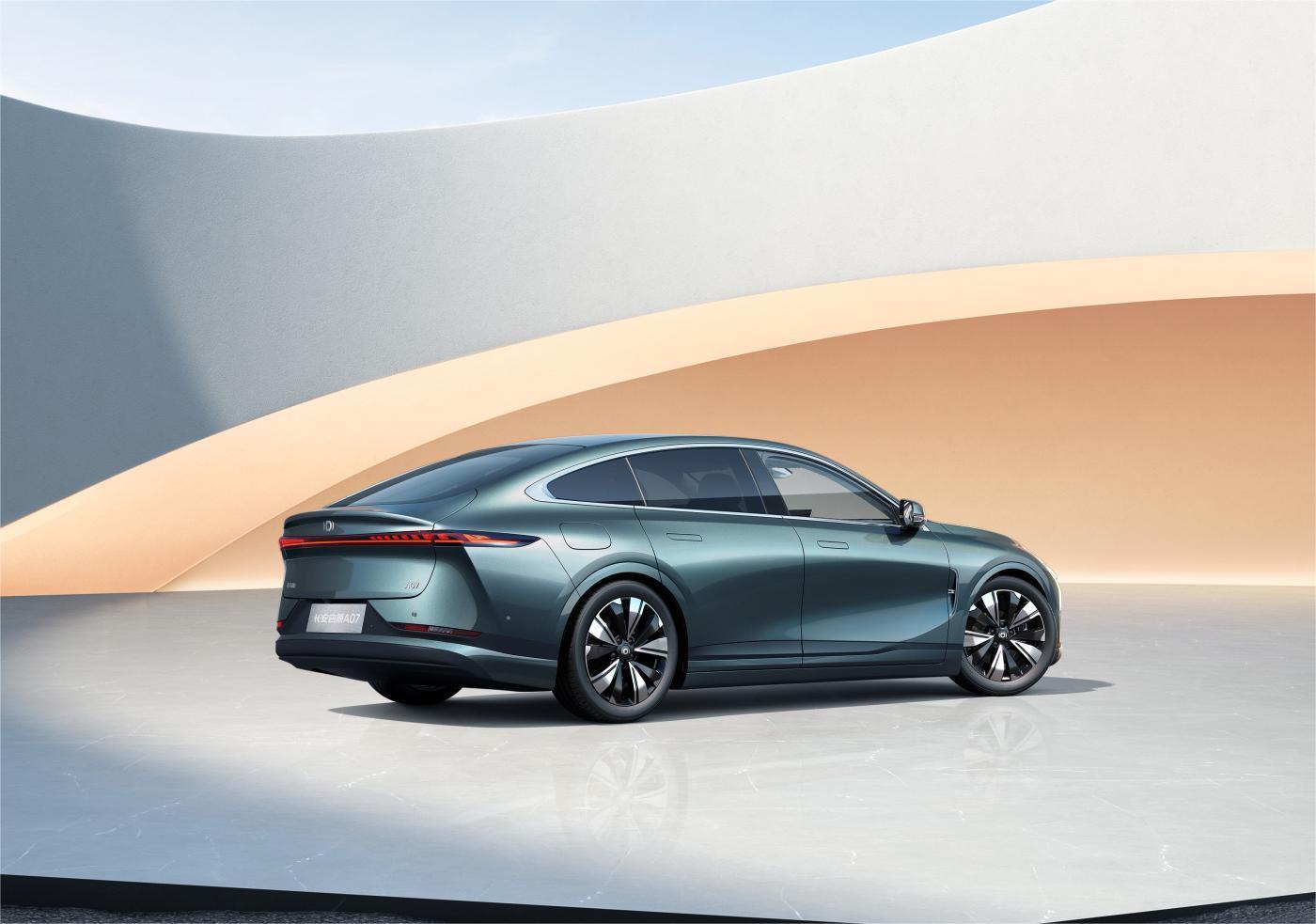 新车侧面造型较为流畅,并采用溜背式车身设计,搭配车窗边框处的镀铬饰条进行点缀时尚感较强。另外,长安启源a07还采用隐藏式车门把手及无框式电吸门设计,并配备大尺寸低风阻造型轮圈。车尾部分,略微上翘的鸭尾式扰流板结合纤细修长的数智飞翼贯穿式尾灯组极具辨识度。车身尺寸方面,该车长宽高分别为4905/1910/1480mm,轴距为2900mm。