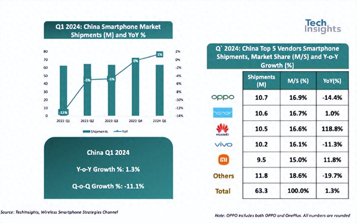 市场研究机构techinsights发布的最新数据显示,2024年第一季度国内智能手机出货量达到6330万台,同比增长1%,结束了连续11个季度的年度下滑趋势。