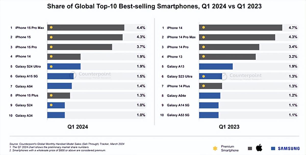 快科技5月7日消息,日前,市场调查机构counterpoint research发布2024年第一季度全球最畅销智能手机排行榜,上榜机型被苹果、三星瓜分,各占5个位置。