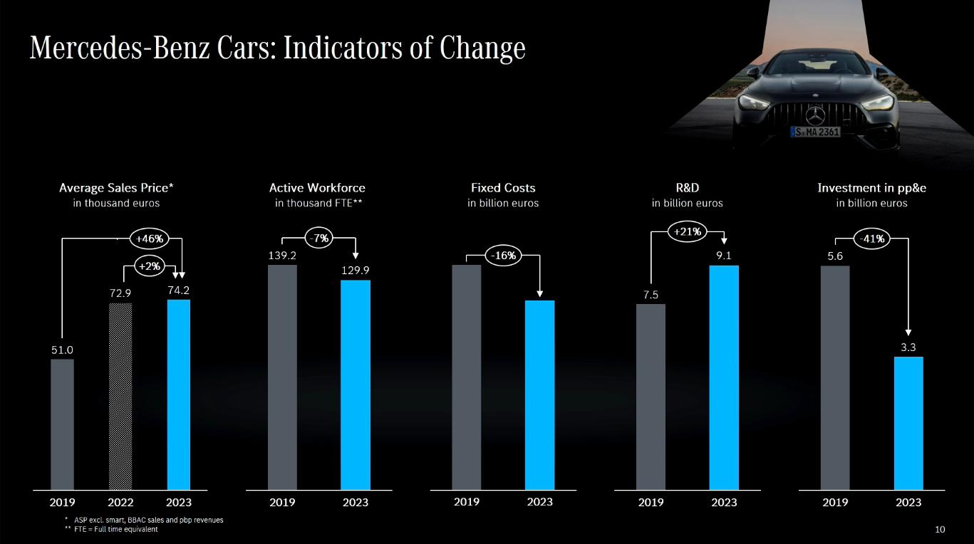 研发方面,2023年研发支出达100亿欧元,而2022年,这一数字为85亿欧元。未来,在平台和技术方面,特别是mb.os的研究和开发成本上升。