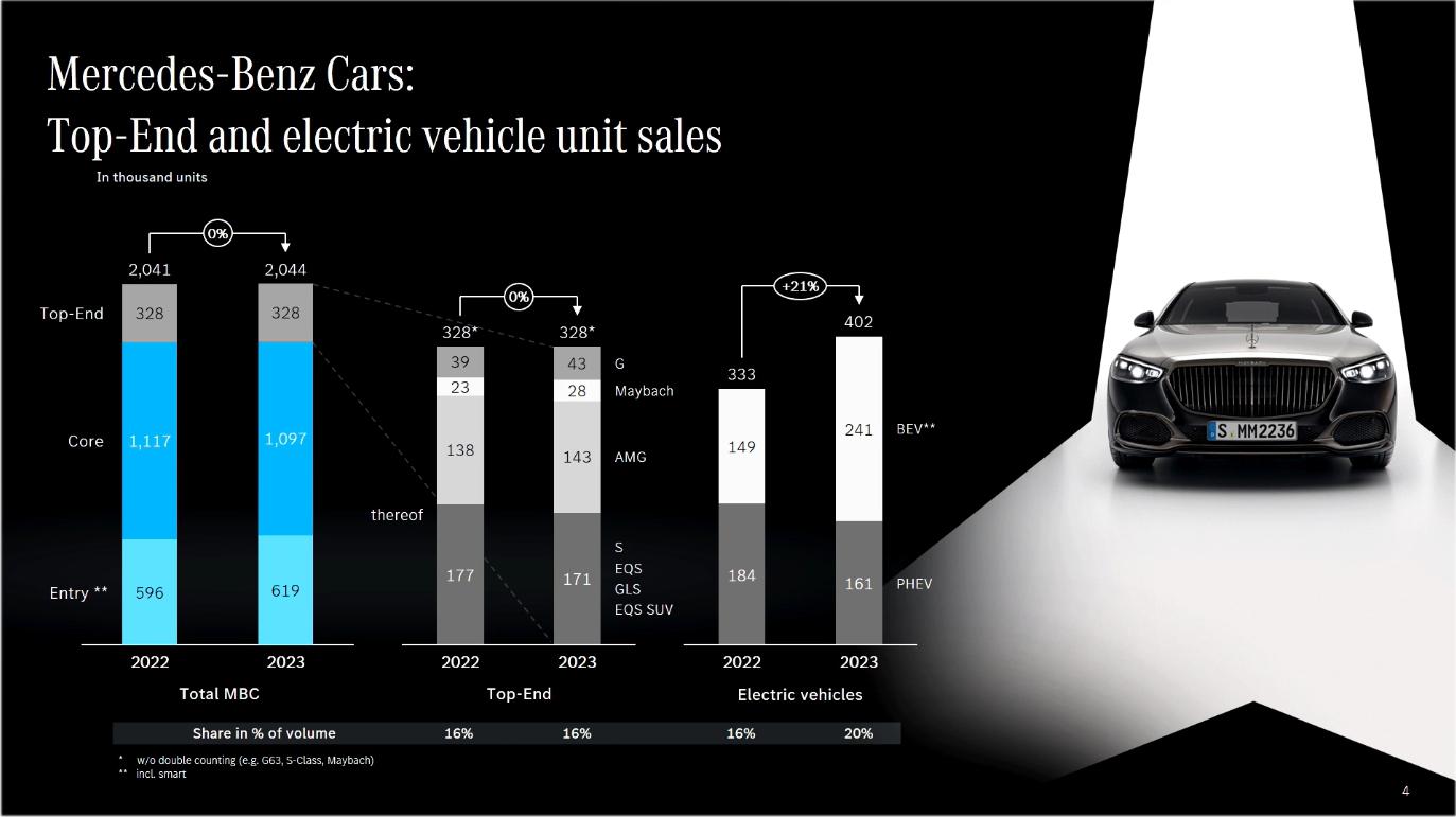 销量方面,该集团2023年达到204.41万辆,其中包括梅赛德斯-迈巴赫( 19%)、g级( 11%)和梅赛德斯-amg( 4%)的销量增长。去年高端汽车销量达到32.83万辆,s级仍然是其细分市场销量位居前列,在所有主要地区保持着50%左右的市场份额。目前,纯电动汽车占梅赛德斯-奔驰汽车总销量的12%。