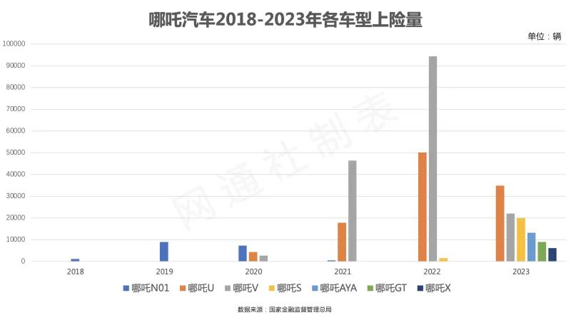 2022年,张勇开始带领哪吒汽车向上攀登。根据国家金融监督管理总局数据,哪吒汽车2021年和2022年上险量最高的车型是哪吒v。在决定逐渐弱化10万元以下低端市场后,2023年哪吒汽车上险量最高的车型成为10万元以上的哪吒u,而哪吒v则留给b端市场和海外市场。