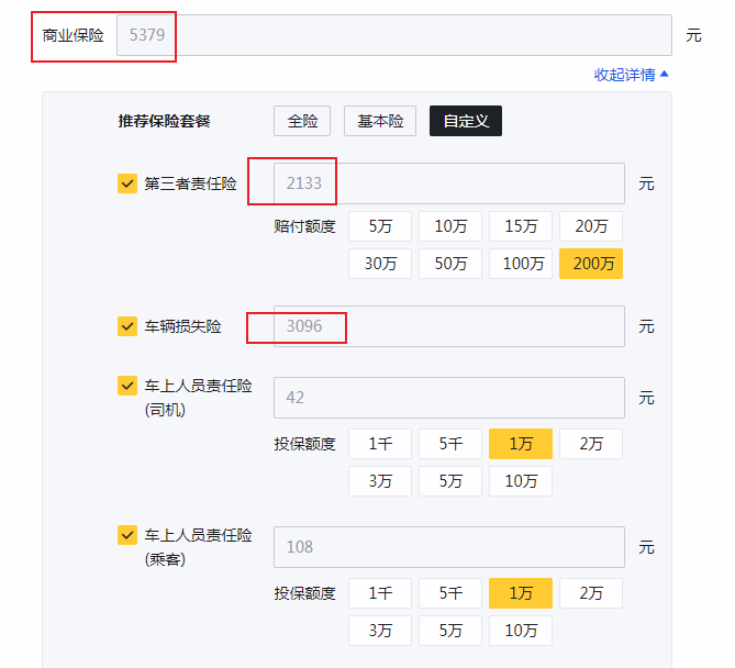 这款车我们按照第三方责任险为200万赔付额来计算,价格为2133元,车辆损失险为3096元,车上人员责任险(司机 乘客)赔付额为1万来计算共150元, 商业险共计5379元,再加上交强险950元,车船税400元。一共为6729元。(每个车主的购买需求和保险公司的销售政策以及车辆年限,保险价格会有变动,最终以实际为准。)
