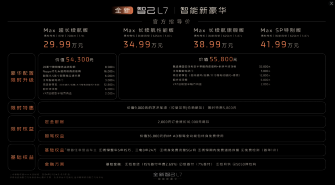 2月24日,新款智己l7正式上市,新车共推出4款车型,售价区间为29.99-41.99万元。作为改款车型,新车主要针对智能化和舒适度进行提升,包括升级英伟达orin x芯片,可实现城市noa功能,同时针对后排座椅等进行了升级。动力方面,继续提供单电机后驱和双电机四驱可选,cltc工况纯电续航分别为708km和625km。