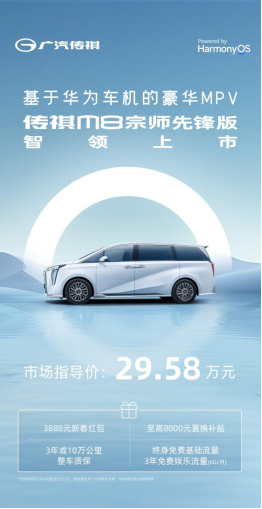 面对智能化大势,传祺以用户体验为中心再次抢跑入局,2月24日,传祺携手华为共同打造的基于华为车机的豪华mpv——传祺m8宗师先锋版上市发布,售价29.58万元,即刻购车可享4重大礼。