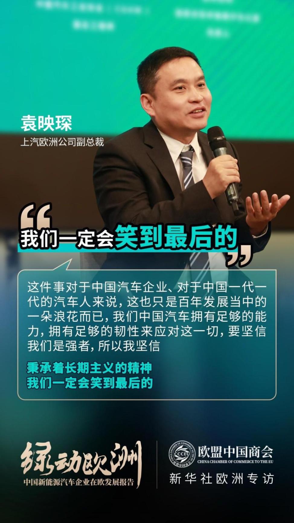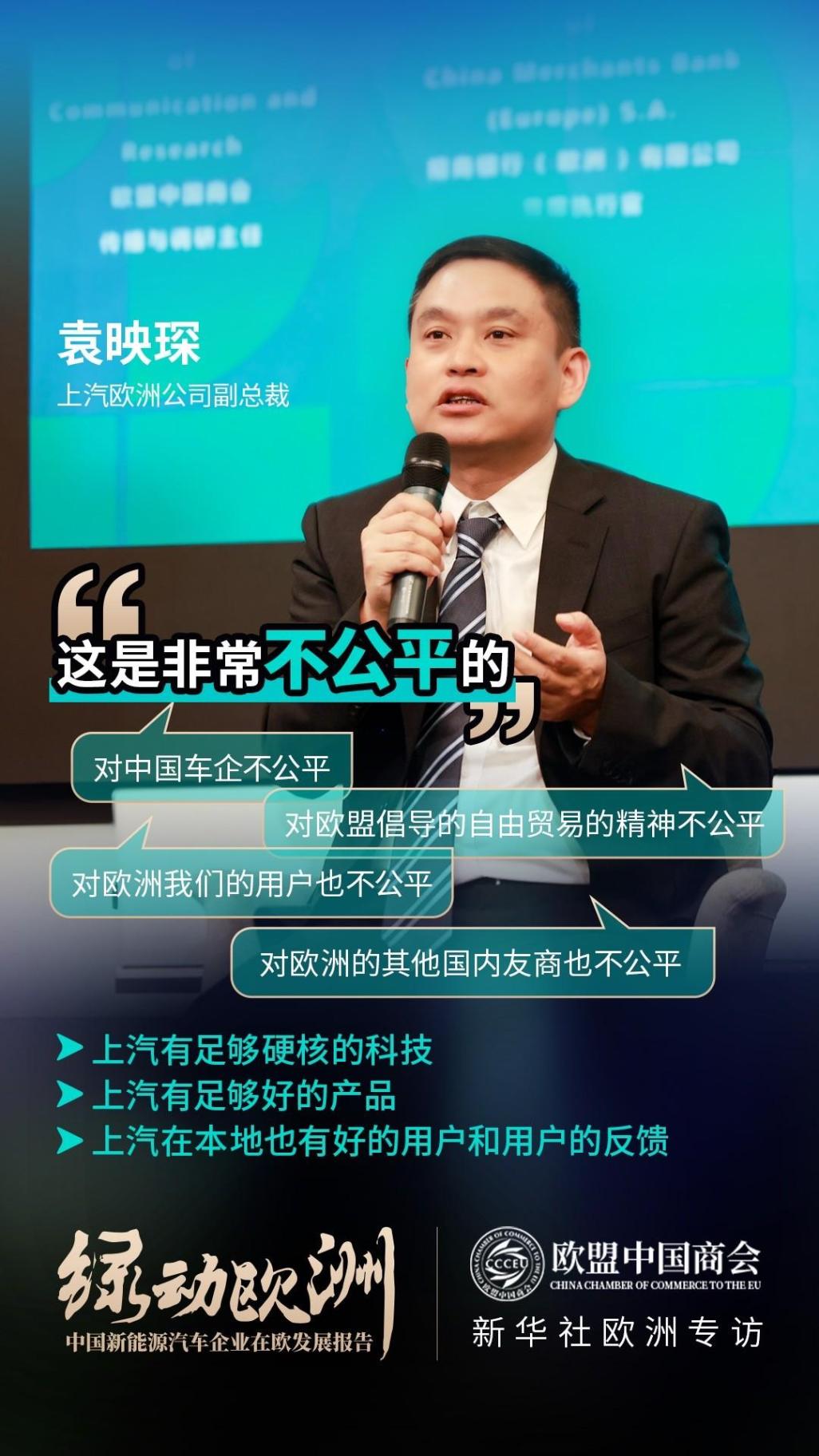在 6 月 19 日比利时布鲁塞尔由欧盟中国商会与新华社中国经济信息社(ceis)上海总部举办的中欧企业家圆桌论坛和《绿动欧洲——中国新能源汽车企业在欧发展报告》发布会上,遭遇欧盟顶格征税打压的上汽集团代表、上汽欧洲公司副总裁袁映琛也对欧委会此前宣布对中国电动车加征临时反补贴税的决定表示反对:“我认为这是极不公平的,对中国车企不公平,对欧盟一直倡导的自由贸易精神不公平,对欧洲的用户不公平,甚至对经销商群体和友商,同样不公平。”