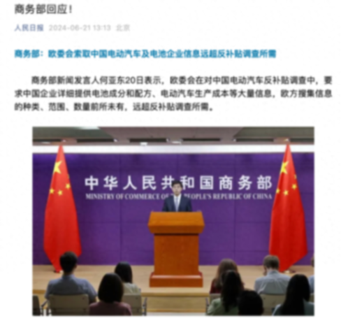 6月20日,商务部新闻发言人何亚东在商务部例行新闻发布会上表示,欧委会在对中国电动汽车反补贴调查中,要求中国企业详细提供电池成分和配方、电动汽车生产成本等大量信息,欧方搜集信息的种类、范围、数量前所未有,远超反补贴调查所需。