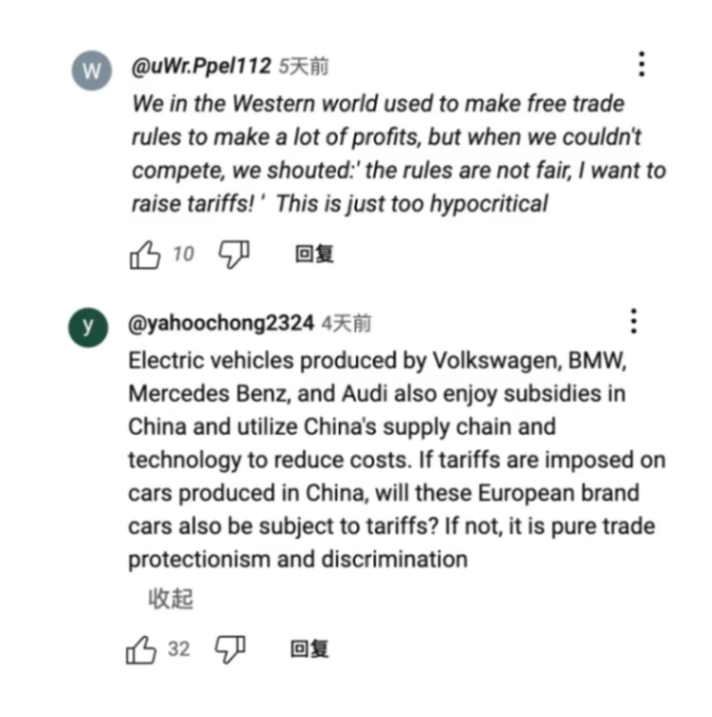 面对此种情况出现,很多国外网友也相继在社交平台上发表了自己的看法,其中就有网友表示:“我们西方世界过去通过制定自由贸易规则来赚大钱,但当我们失去竞争力的时候,我们却大喊‘规则不公平,我要提高关税!’这实在太虚伪了。”还有网友表示:“大众、宝马、奔驰和奥迪生产的电动汽车也在中国享受补贴,并利用中国的供应链和技术来降低成本。如果对中国生产的汽车征收关税,这些欧洲品牌的汽车也会被征收关税吗?如果不是,那就是纯粹的贸易保护主义和歧视。”