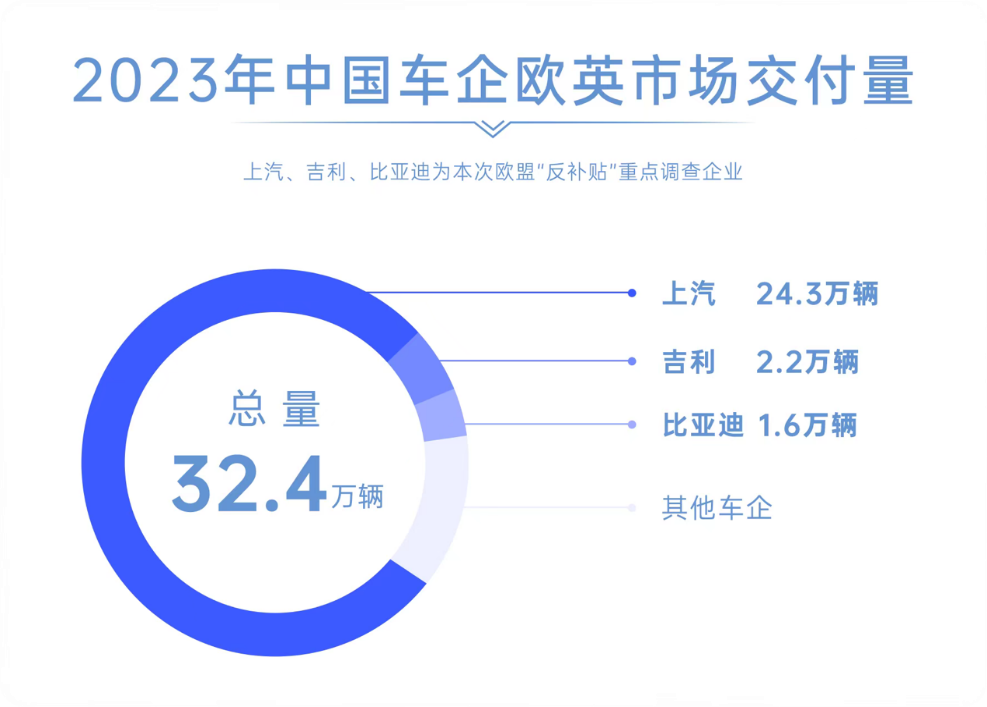 在5g市场上一骑绝尘的华为遭欧美联手恶意制裁的过往仍历历在目,此次连续8年成为中国车企“出海一哥”的上汽集团又成为欧盟顶格打压的目标,外界普遍认为这与上汽在海外市场上的销量迅速崛起有关。2023年上汽集团海外销量突破120万辆,助力中国汽车海外销量以468万辆的规模首次超越日本跃居全球第一。尤其是在欧英市场,上汽集团交付量高达24.3万辆,占所有中国汽车欧英市场交付量的75%。