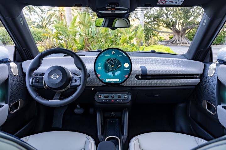 电动mini cooper的内饰还原了概念车较多的设计元素,最吸引眼球的莫过于直径达到240毫米的圆形oled中控屏。这种异形屏相比市面上常规的宽屏、纵屏更有辨识度和可玩性。同时,mini厂商为了适配圆形屏,还采用了最新的mini operating system 9操作系统,系统ui界面布局沿圆形屏布置,拥有独一无二的软件显示效果。