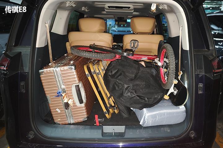 规整的后备箱更是一大看点,345l大空间足以容纳日常出行的行李物品,将后排座椅均放倒后,容积更是可扩充至1917l,这比其它两款车型的装载空间都要大。从实际装载的表现来看,传祺e8不仅可将行李箱、椅子、背包、滑板车容纳,甚至自行车也可以放进去。无论是家庭出游还是搬运大件物品,传祺e8都能轻松应对,这是其它两款suv车型所无法比拟的。或许这就是东北人之所以钟情传祺e8的关键所在吧!