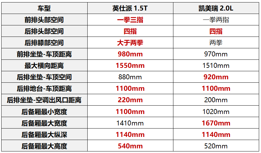 写在最后:综上不难看出,英仕派1.5t在空间设计上展现出了显著的优势,无论是前排、后排还是后备厢空间,均优于凯美瑞2.0l。这一优势不仅提升了乘客的乘坐舒适度,也为车主的出行提供了更大的便利。同时,英仕派1.5t在性能、油耗和噪声控制等方面也表现出色,是一款值得推荐的优秀车型。