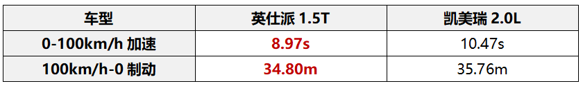当然,作为一款优秀的车型,英仕派1.5t在其他方面也展现出了不俗的实力。在性能方面,其1.5t涡轮增压发动机在测试中表现出色,0-100km/h加速时间仅为8.97秒,比凯美瑞2.0l快了近1.5秒。在制动性能方面,英仕派1.5t的制动距离略短,体现了其优异的制动性能。