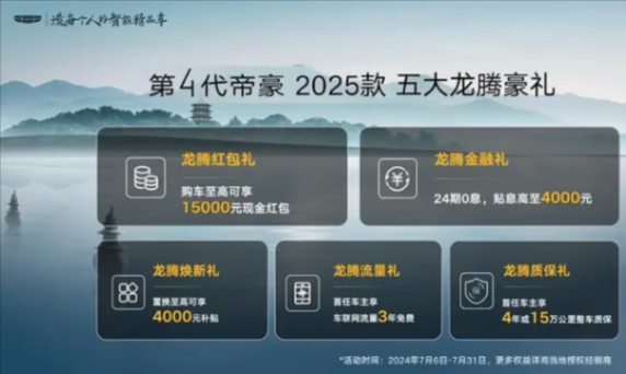 购车可享5重礼,包括15000元购车红包;24期0息,贴息高至4000元;4000元置换补贴;首任车主享车联网流量3年免费和4年或15万公里整车质保。活动时间为7月6日-7月31日(详情请咨询当地经销商)。