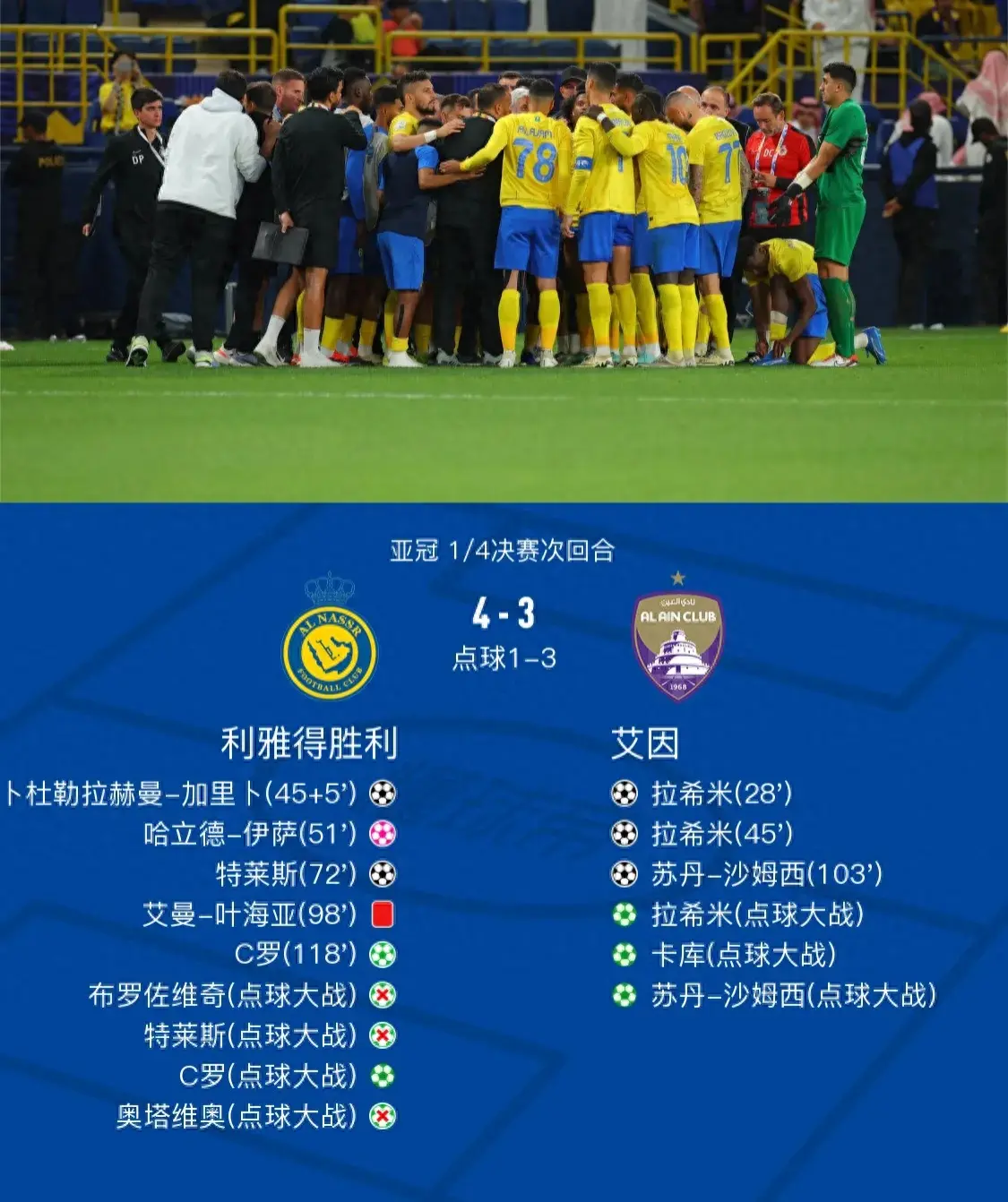 2023-24赛季亚冠1/4决赛次回合展开对决利雅得胜利坐镇主场迎战阿尔艾因,首回合胜利0-1落后对手。回到主场,球队势必要全力以赴。上半场拉希米梅开二度,完成两回合帽子戏法,c罗打门被扑,加里卜门前推射扳回一球。