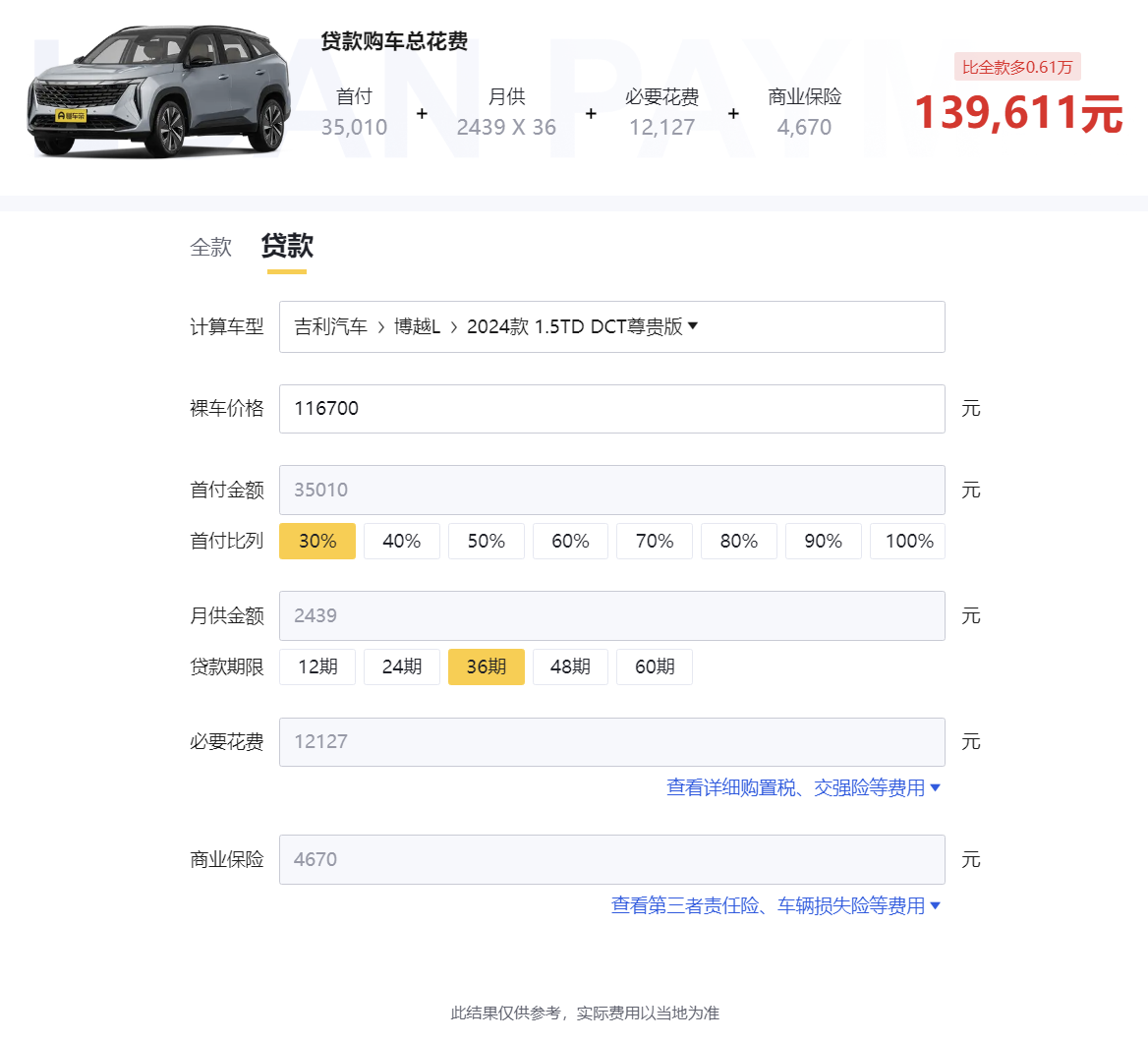 价格方面,车子的指导价为12.57万,据小编所在地福州,终端显示优惠9000元,优惠后裸车价格为116700元,必要花费12127元(其中购置税10327元,车船税350元,交强险950元,上牌费500元),商业保险4670元(其中第三方责任险按100万元的赔付计算,费用为1917元、车辆损失险2033元,车上人员责任险(乘客)、车上人员责任险(司机)、车身划痕险总合约720元,赔付额度可以根据自己的需求选择),考虑到部分消费者想分期付款,这里也给出贷款的明细,以首付比例30%为例子,首付金额35010元,分36期,月供金额2439元,贷款购车总花费139611元,比全款多比全款多0.61万。对于一台家用紧凑型suv来说,该车的售价不高,对于家庭工薪家庭的用户来说不会有太大压力。