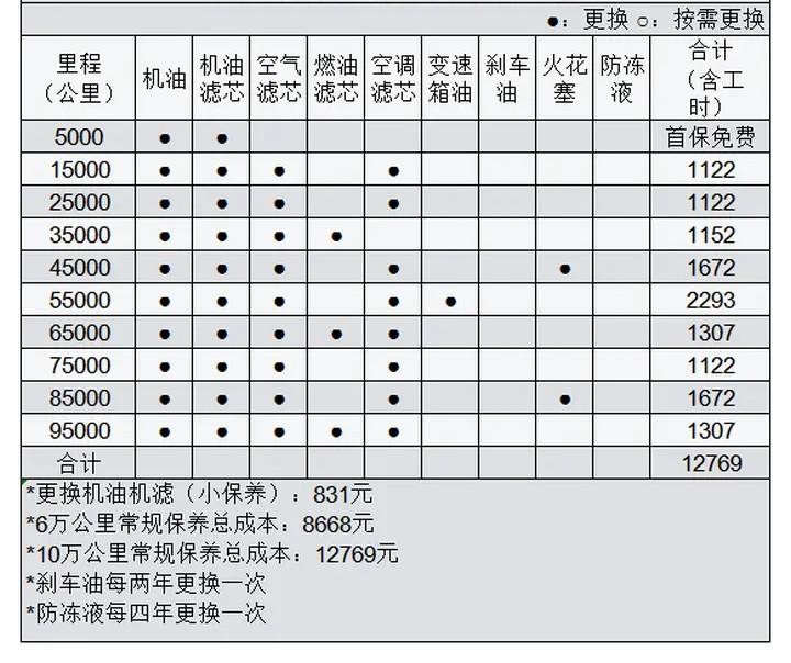 保养方面,根据保养手册,车辆的首保里程为5000km,建议保养间隔为10000公里或12个月(以先到者为准)。6万公里内的保养项目及费用大致包括:机油、机油滤清器、空气滤清器、空调滤清器、燃油滤清器、刹车油、火花塞及一些常规检查,预计费用约为8668元,平均每年约1444元。对于一台紧凑型suv来说,这样的保养费用表现可观。