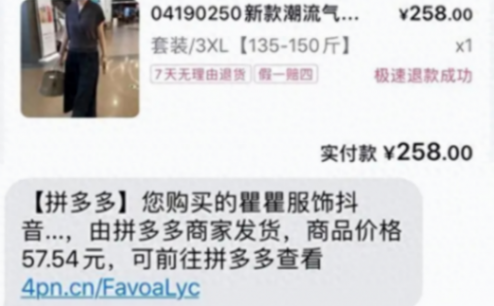 据悉,一位消费者在某音的一家店铺下单购买了一款女装,支付了258元。然而,仅仅一天后,她竟收到了一条来自某拼单平台的发货短信,而短信显示她所购买的商品仅为57.54元。这突如其来的价格差异让消费者震惊,她发现自己在某音店铺购买的正是同款商品,价格竟相差近五倍。