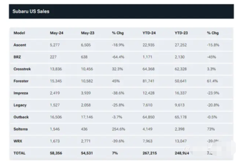 斯巴鲁的纯电动车型solterra ev(可视为换标bz4x车型)也取得了显著的增长,年迄今销量增长了70%,5月份的销量更是增长了255%,这表明斯巴鲁在新能源汽车市场上的发展势头良好。然而,斯巴鲁的双门跑车brz车型在5月份的销量却出现了下滑,仅售出227辆,较2023年5月售出的638辆下降了64%。这可能是由于市场对于跑车车型的需求减少,或者消费者对于该车型的兴趣减弱所致。