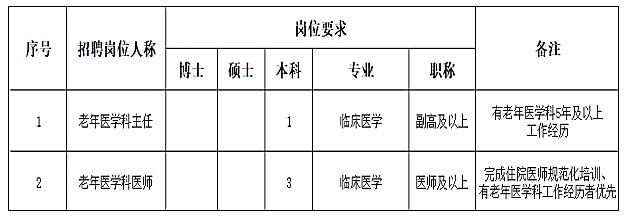 根据医院发展需要,现面向社会急招老年医学科主任、医师,有关招聘事项公告如下: