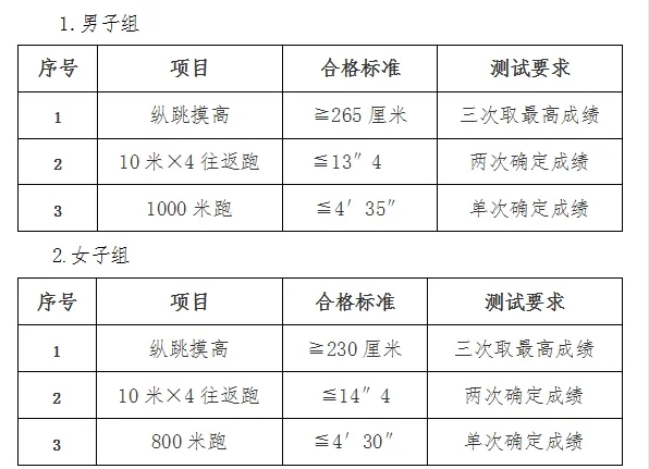 体能测评项目及合格标准如下: